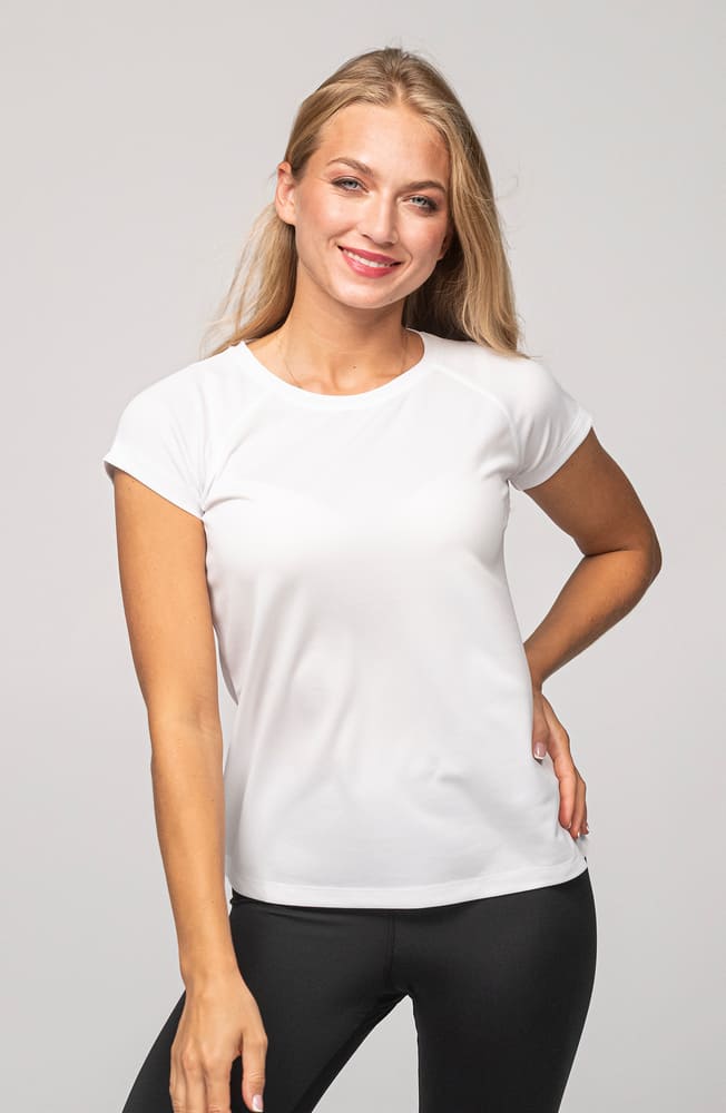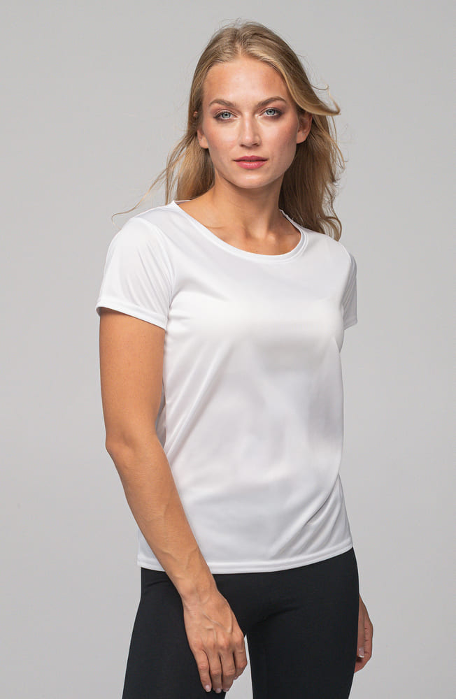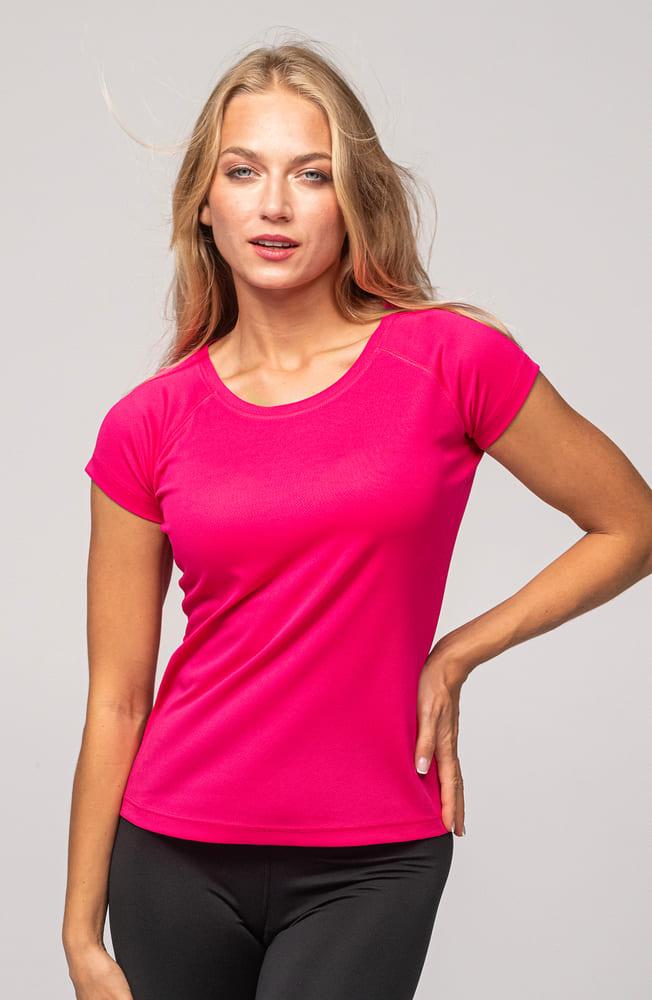 - Sportowy t-shirt damski wykonany z gładkiego materiału typu interlock.